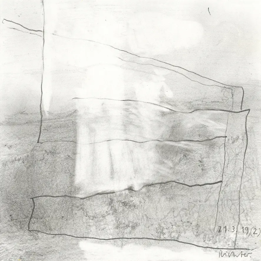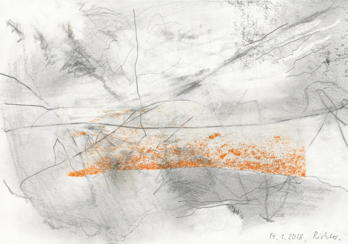 Zeichnungen begleiten das malerische Werk von Gerhard Richter bereits seit 1964. Die ab 1976 entstandenen Blätter lehnen sich vor allem an das komplexe Formenrepertoire der parallel entstehenden Abstrakten Bilder an und zeichnen sich durch ihre individuellen Formate und den erstmaligen intensiven Einsatz von farbigen Stiften aus, der diesen Blättern seine spezifische, malerische Anmutung verleiht. Richter selbst stand der künstlerischen Gattung der Handzeichnung immer kritisch gegenüber. Ebenso wie er die traditionellen druckgrafischen Techniken der Radierung oder der Lithografie stets vermieden hat, empfindet er diese als zu sehr von einer kunsthandwerklichen Geschicklichkeit und Ästhetik geprägt. In seinen Arbeiten auf Papier hat er gegen diese traditionellen Qualitäten des Mediums immer angearbeitet. So entstanden seine ersten Aquarelle von 1977/78 auf dünnem, liniertem Schreibpapier, das sich unter dem Auftrag der Wasserfarben auffällig wellte, was von Experten als ein grober technischer Mangel angesehen wird.